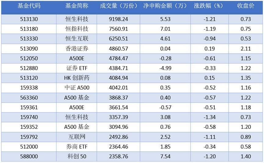 从成交量上来看,2025年11月20日成交量最大的是恒生科技(513130),成交量为9198.24万份。排名靠前的恒指科技(513180)、恒生互联(513330)、香港证券(513090),成交量分别为7560.91万份、6250.51万份、4860.57万份。
