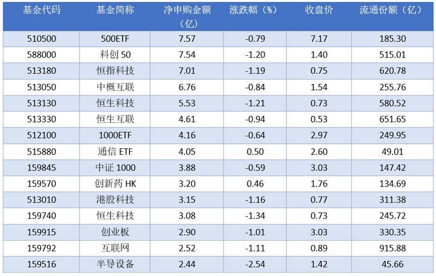 细分到资金流动情况上来看,2025年11月20日净申购金额最大的为500ETF (510500),当日净申购金额为7.57亿元。排名靠前的科创50 (588000)、恒指科技(513180)、中概互联(513050),申购金额为7.54亿元、7.01亿元、6.76亿元。