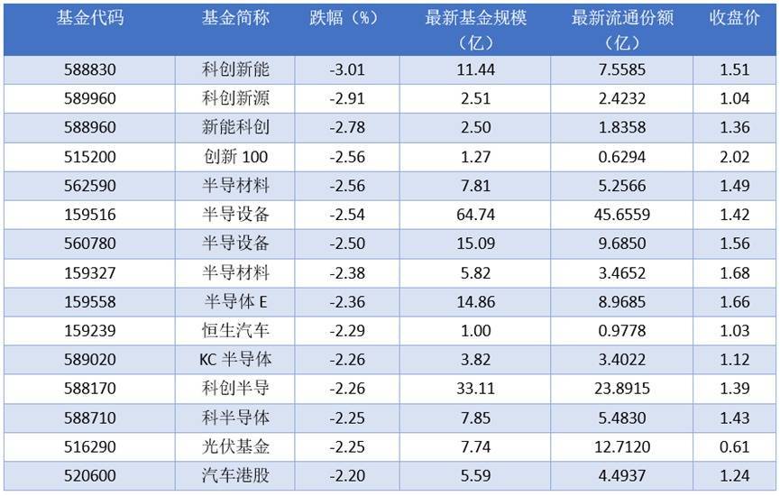 下跌方面,2025年11月20日跌幅最大的是科创新能(588830),跌幅达到3.01%。排名靠前的科创新源(589960)、新能科创(588960)、创新100 (515200),跌幅分别为2.91%、2.78%、2.56%。
