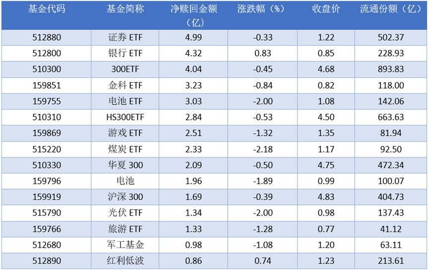 资金流出方面,2025年11月20日净赎回金额最多的是证券ETF (512880),赎回金额4.99亿元。排名靠前的银行ETF(512800)、300ETF (510300)、金科ETF(159851),赎回金额分别为4.32亿元、4.04亿元、3.23亿元。