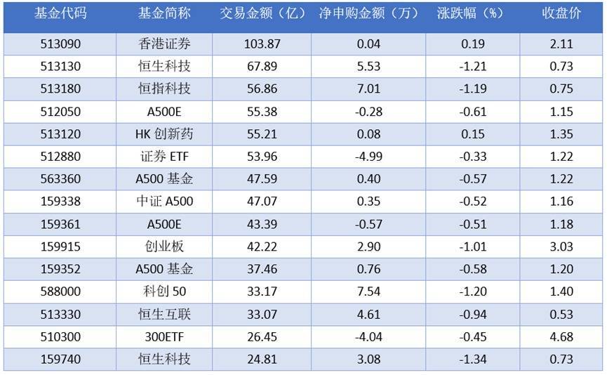 从成交金额上来看,2025年11月20日成交额最大的是香港证券(513090),交易金额103.87亿元。排名靠前的恒生科技(513130)、恒指科技(513180)、A500ETF (512050),成交额分别为67.89亿元、56.86亿元、55.38亿元。